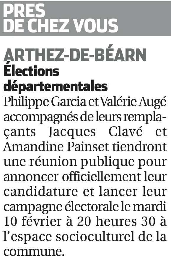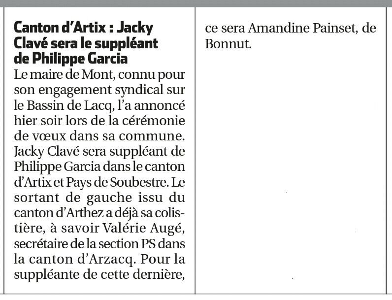 "Mon binôme sera Valérie Augé, secrétaire de la section PS d'Arzacq. Quant à nos remplaçants, il y aura une jeune femme de Bonnut et un maire du canton d'Arthez. Mais là, rien n'est encore fixé définitivement " explique Philippe Garcia.
