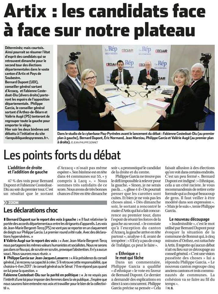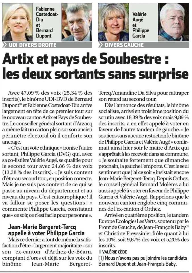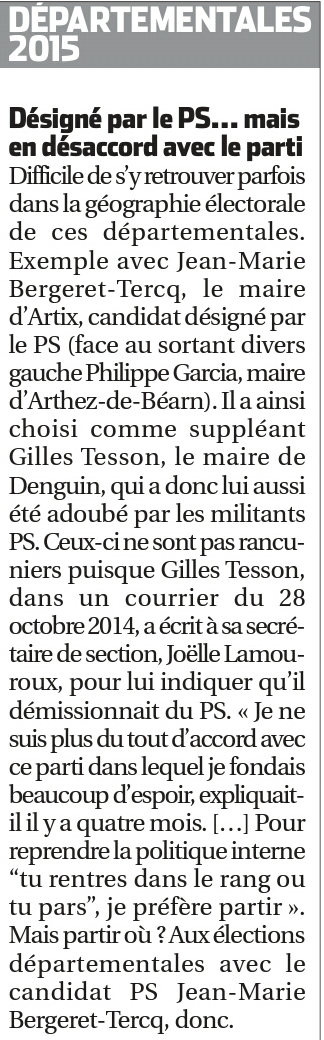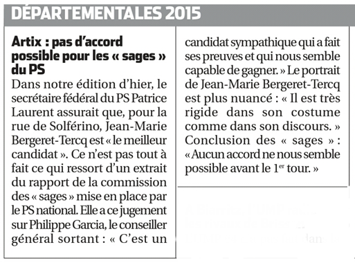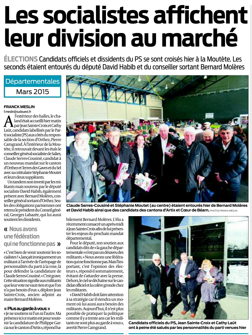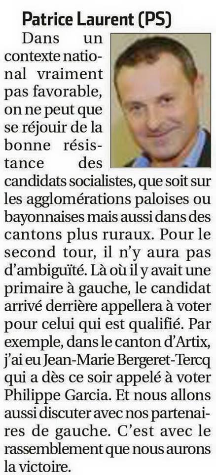 "J' espère que les électeurs sauront éviter le piège de la dispersion. Pour permettre à la gauche d'être présente au second tour, il faut voter utile pour le candidat qui permettra de continuer et renforcer le travail de l'équipe sortante." Claude Bartolone, Président de l'Assemblée Nationale, en visite dans le Béarn le 6 mars 2015.