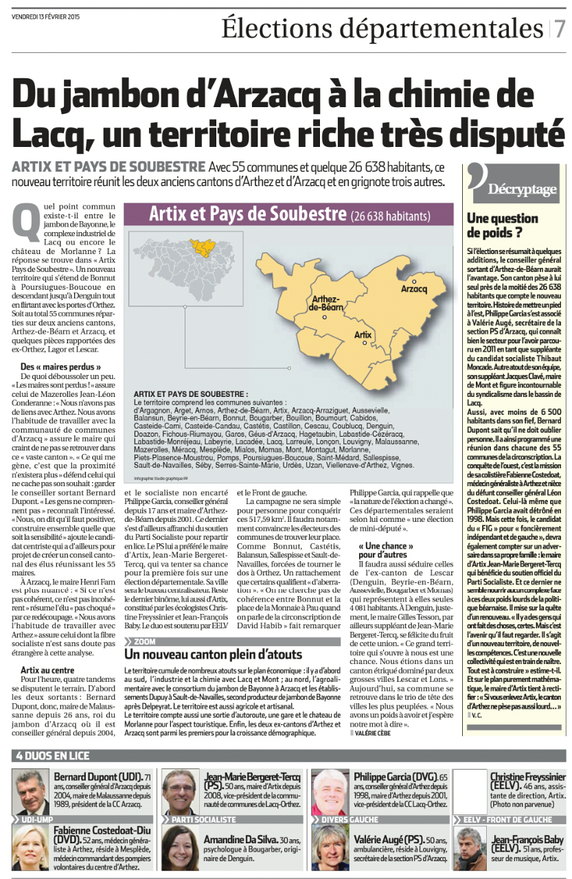 Le nouveau canton d'Artix et Pays de Soubestre (Arthez + Arzacq + cinq communes du canton d'Orthez + Beyrie-en-Béarn + Lacq + Mont + Aussevielle, Denguin, Momas et Bougarber) sera lui aussi très disputé.